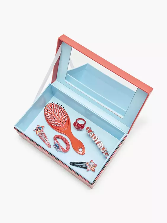 - Set bestehend aus: Schatulle inklusive Accessoires: 2 Haarspangen, Ring, Bürste, Armband, Haarband